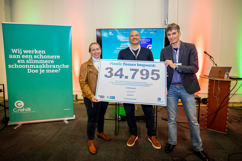 Van links naar rechts op de foto: Irene Dros en Jeroen Dagevos Plastic Soup Foundation met Pim Hilgerdenaar van Crohill.Crohill heeft in anderhalf jaar tijd met hun schoner schoon partners 34.795 plastic flessen weten te besparen. ... Lees meer