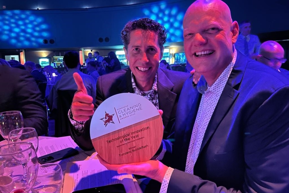 De jaarlijkse European Cleaning & Hygiene Awards erkennen en vieren innovatieve prestaties en excellentie in de schoonmaak- en hygiëne-industrie over heel Europa. De ‘Technological Innovation of the Year Award’ wordt toegekend aan de meest baanbrekende technologische innovatie die de normen in de sector heeft verhoogd en een significante impact heeft gehad op het verbeteren van de efficiëntie en duurzaamheid. “Het winnen van de award voor de beste technologische innovatie van het jaar is een prachtige bekroning op alle inspanningen die we gezamenlijk hebben geleverd in de ontwikkeling van de BubbleFlush”, vertellen Hans Paul Visscher, directeur/eigenaar van Wecovi, en Dennis Luiten, directeur/eigenaar van TranZero.