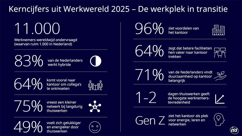 Hybride werken is blijvend, maar het fysieke kantoor krijgt een nieuwe betekenis. Uit het rapport, Werkwereld 2025: De werkplek in transitie van ISS Facility Services, blijkt dat 96% van de werknemers het kantoor nog altijd waardevol vindt. Niet om achter een bureau te zitten, maar als plek voor verbinding, samenwerking en ontwikkeling. Het onderzoek is gebaseerd op de ervaring van bijna 11.000 werknemers in 15 landen, waaronder ruim 1.000 in Nederland.