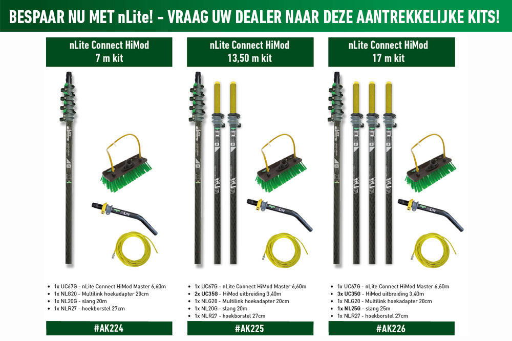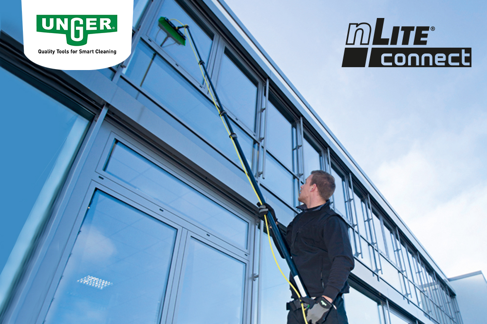 De basissteel, bestaande uit vier elementen, reinigt tot een hoogte van 6,60 m. Maar nog hogere plaatsen worden met gemak bereikt wanneer twee uitbreidingstelen aan het onderste uiteinde van de basissteel worden bevestigd. Deze uitbreidingstelen vergroten het bereik tot 3,40 m elk, maar niet – en dat is cruciaal – de diameter van de steel van 35 mm, een optimale omtrek voor de professional met perfect bedieningscomfort voor snel en comfortabel werken. Dankzij de ideale combinatie van (licht) gewicht en stijfheid biedt het nLite Connect systeem de schoonmaakprofessional maximaal gebruiksgemak en de beste schoonmaakresultaten, zelfs bij werkzaamheden op een hoogte van ongeveer 20 m.